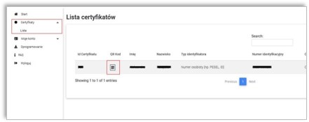 - Przejdź do zakładki „Certyfikaty”, następnie „Lista” i kliknij w ikonę „QR Kod”.