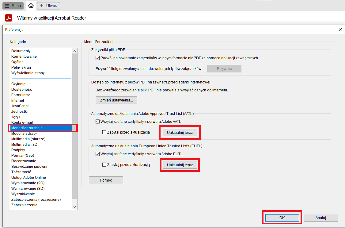 Po zaktualizowaniu list AATL i EUTL klikamy przycisk OK, następnie ponownie otwieramy plik PDF - to wymusi ponowną weryfikację podpisów.Czy ten artykuł był pomocny?